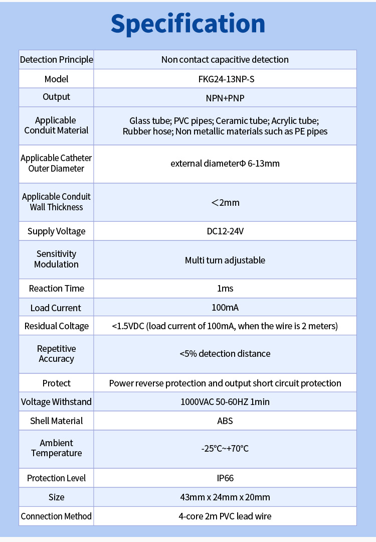FKG24-13NP-S CONCONDATION DE DÉTECTION DE BAS CONCONDATION DU TUBE DE TUBE CAPTEUR PERFORMANCE CAPPORTS: