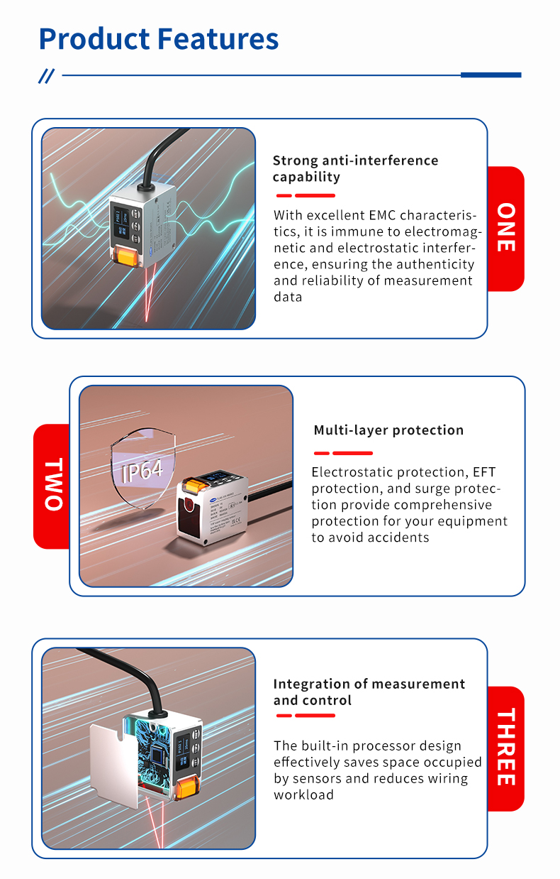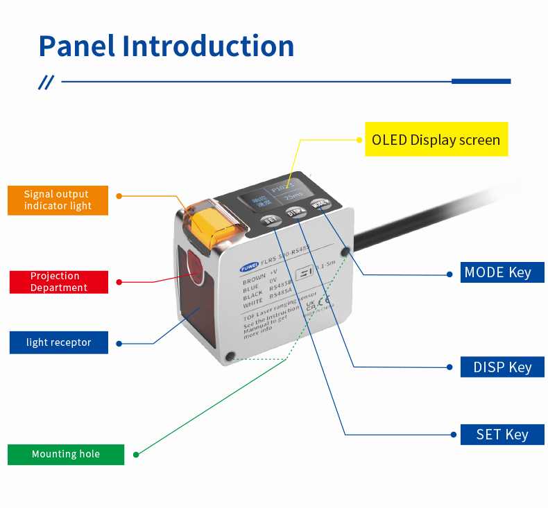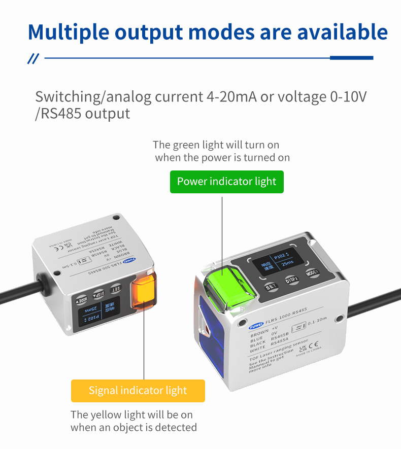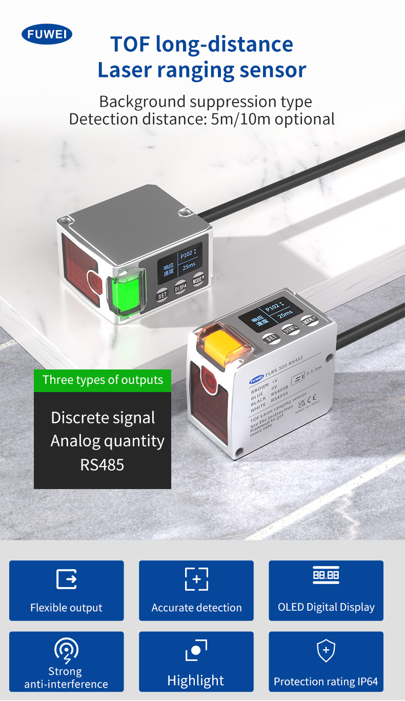 Présentation du capteur de distance laser série FLRS, une solution haute performance conçue pour des mesures longue distance précises et fiables. Utilisant la technologie avancée de temps de vol (TOF) avec suppression de l'arrière-plan, ce capteur offre des plages de détection flexibles allant jusqu'à 5 m ou 10 m, ce qui le rend adapté à une variété d'applications industrielles. Conçu avec des capacités anti-interférences supérieures et d'excellentes caractéristiques CEM, il résiste efficacement aux perturbations électromagnétiques et électrostatiques, garantissant des données cohérentes et fiables dans des environnements difficiles.