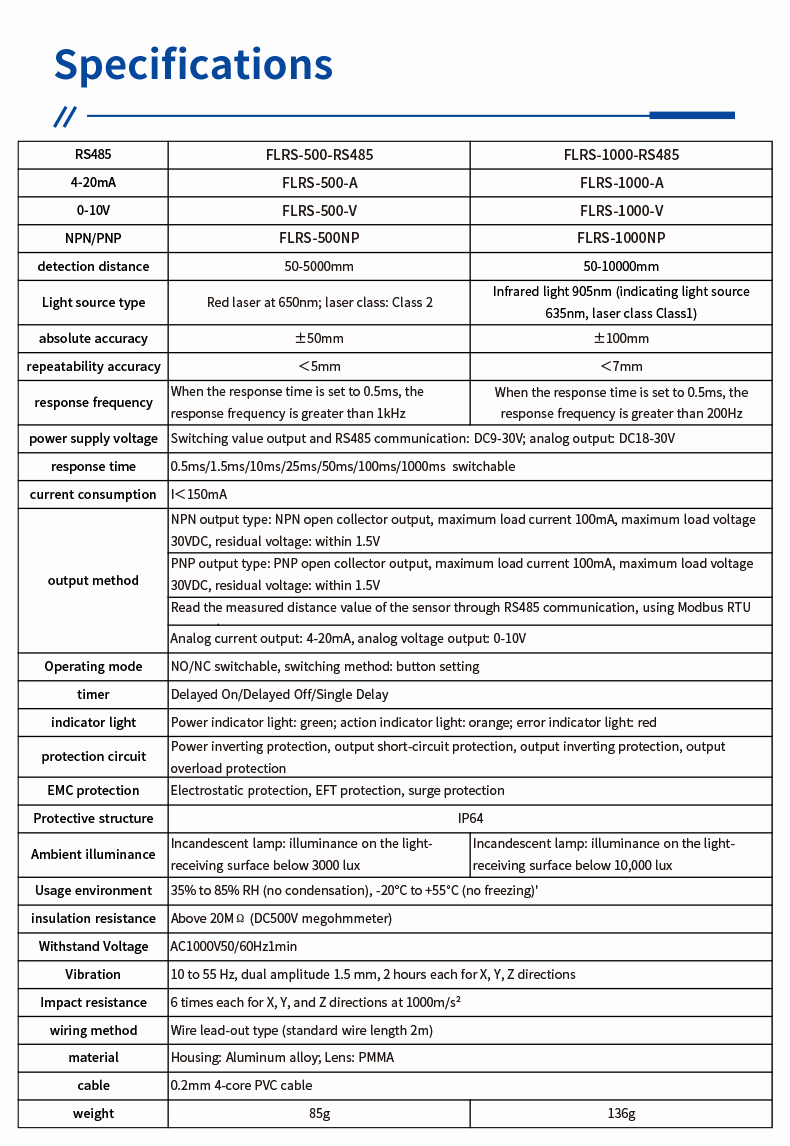 Construite avec une protection multicouche, y compris une protection électrostatique, EFT et contre les surtensions, la série FLRS protège votre équipement et améliore la sécurité opérationnelle. Sa conception compacte et intégrée de mesure et de contrôle minimise les besoins en espace et réduit la complexité du câblage, offrant à la fois efficacité et facilité d'installation. Choisissez parmi des modèles tels que le FLRS-1000-RS485 (50 à 10 000 mm) ou le FLRS-500-RS485 (50 à 5 000 mm) pour répondre aux exigences spécifiques de votre gamme.
