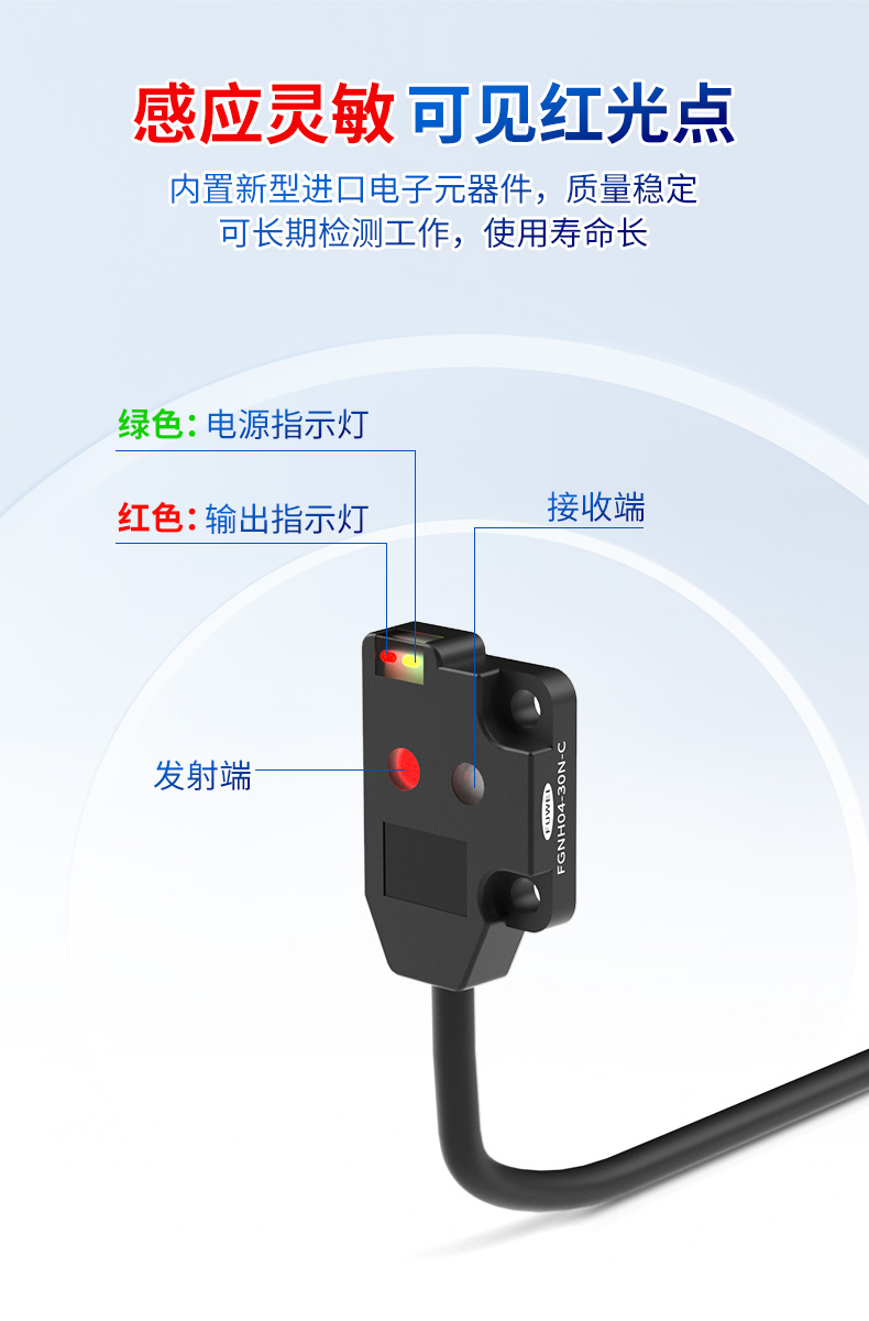 Deuxièmement, le capteur intègre de nouveaux composants électroniques importés, offrant une détection très sensible avec un point d'émission de lumière rouge visible. Cela améliore considérablement la visibilité et la précision de la détection. Avec une qualité stable, un soutien à un fonctionnement continu à long terme et une durée de vie prolongée, il est particulièrement adapté aux environnements industriels exigeants. Pour les applications nécessitant une répétabilité et une fiabilité élevées, telles que les capteurs détectant les broches sur les LED - cette caractéristique réduit considérablement les taux de détection de faux et la fréquence de maintenance de l'équipement, renforçant ainsi l'efficacité globale de production.