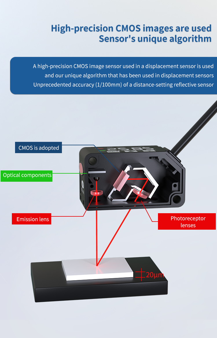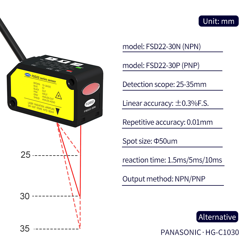 Percée technologique de base : la précision atteint de nouveaux sommets La série FSD22 utilise des capteurs d'image CMOS de haute précision combinés aux algorithmes de base exclusifs de Fuwei Electronics, réalisant une percée technologique dans les capteurs réfléchissants de réglage de distance : la précision atteint un étonnant 1/100 mm, dépassant de loin les performances des capteurs traditionnels. Un traitement algorithmique unique garantit des données de mesure stables et fiables dans diverses conditions, maintenant une stabilité de détection exceptionnelle même sur des surfaces réfléchissantes ou des arrière-plans complexes.