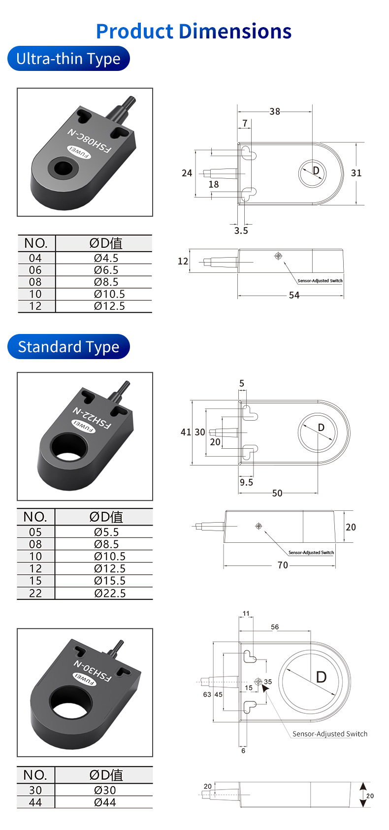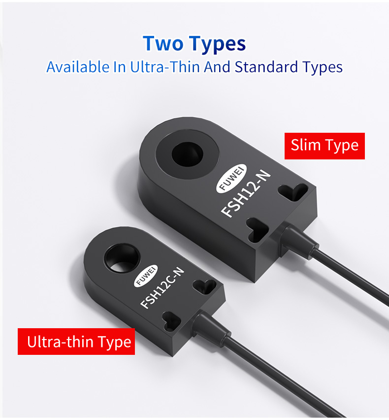 Un capteur pour chaque application Nous comprenons qu'il n'y a pas deux configurations d'automatisation identiques. C'est pourquoi la série FSH05-FSH44 est disponible en deux facteurs de forme distincts et en plusieurs tailles d'ouverture. Type ultra fin : idéal pour les environnements à espace restreint où l'espace de montage est limité. Son profil mince permet une installation dans des machines étroites sans compromettre les performances de détection. Type standard : offre des performances robustes pour les applications générales, fournissant une solution de détection robuste et fiable.