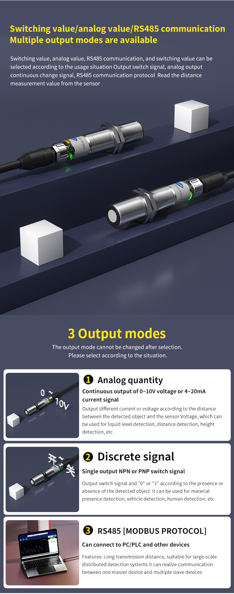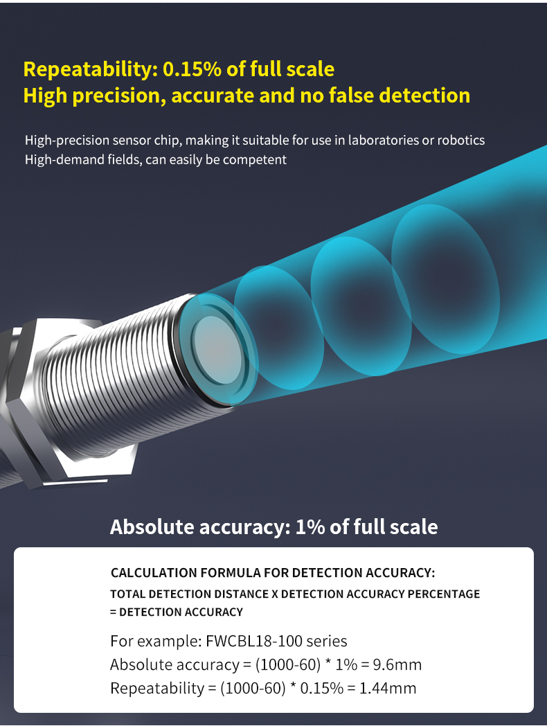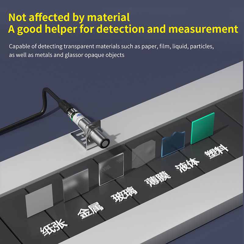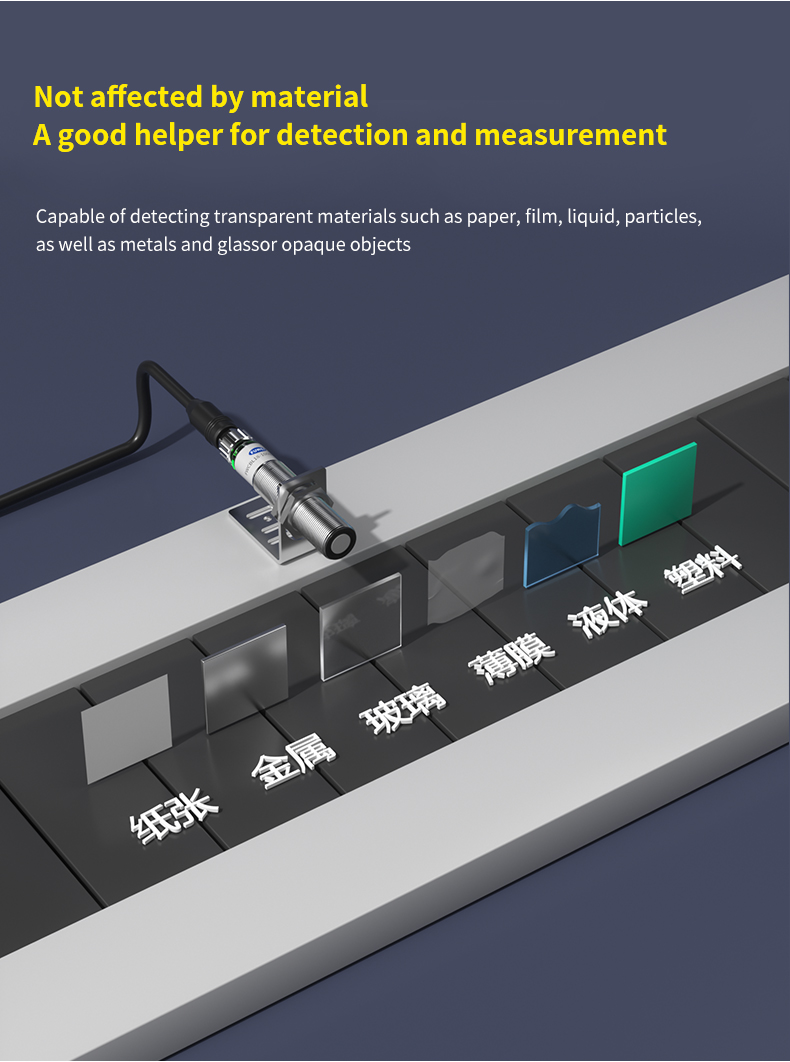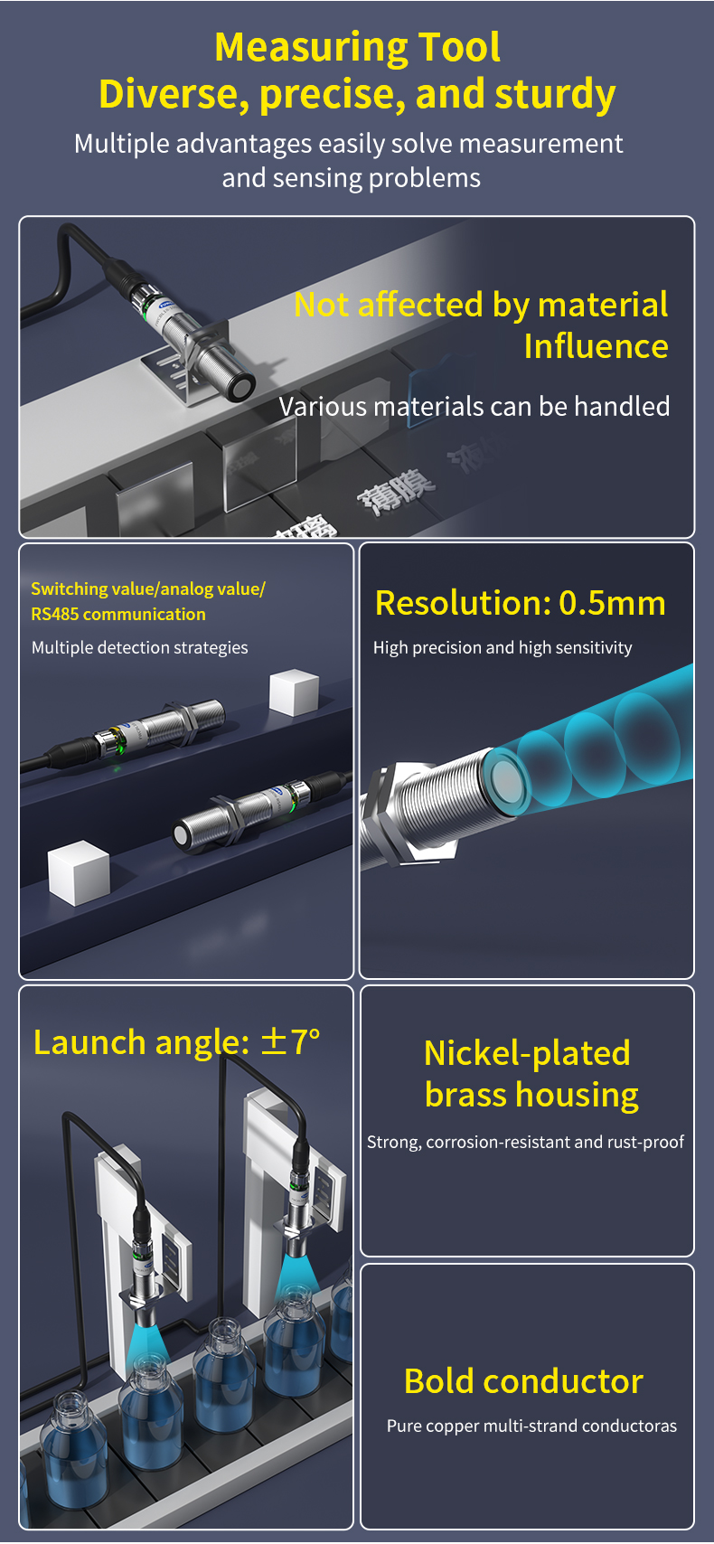 Doté d'une haute précision d'une résolution de 0,5 mm et d'un angle d'émission étroit de ±7°, il garantit une précision de mesure extrême et une excellente résistance aux interférences. Quelle que soit la surface cible (absorbante de lumière, réfléchissante ou transparente), il offre des performances stables, totalement indépendantes du matériau ou de la couleur de l'objet détecté.