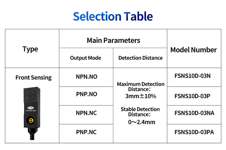 Avant de plonger dans les spécifications techniques, clarifions la valeur fondamentale que le FSNS10D-03N apporte à votre système : Obtenez une détection « zéro défaut » avec une stabilité inégalée : Conçu avec des capacités de détection stables et une forte capacité anti-interférence, ce capteur ignore de manière fiable l'encombrement métallique environnant et le bruit électrique. Cela se traduit directement par une réduction des temps d'arrêt, une qualité de produit supérieure et des coûts de maintenance réduits. Débloquez des vitesses plus élevées grâce à une réactivité intelligente : la puce intelligente intégrée garantit une vitesse de réponse exceptionnellement rapide, permettant une détection précise dans les processus automatisés à grande vitesse. Cela vous permet d'augmenter les temps de cycle et de maximiser le débit sans sacrifier la précision. Conquérir les défis environnementaux et spatiaux : sa conception compacte permet une installation facile dans divers espaces de travail d'installation étroits. Associé à un indice d'étanchéité IP67 à l'eau et à la poussière, il fonctionne de manière fiable dans des environnements où d'autres capteurs échoueraient, offrant une flexibilité et une durabilité d'installation inégalées. Simplifiez l'intégration avec la polyvalence de la double détection : uniques dans sa catégorie, les deux modes de détection vous permettent d'adapter le comportement du capteur à vos conditions d'installation réelles spécifiques. Ce